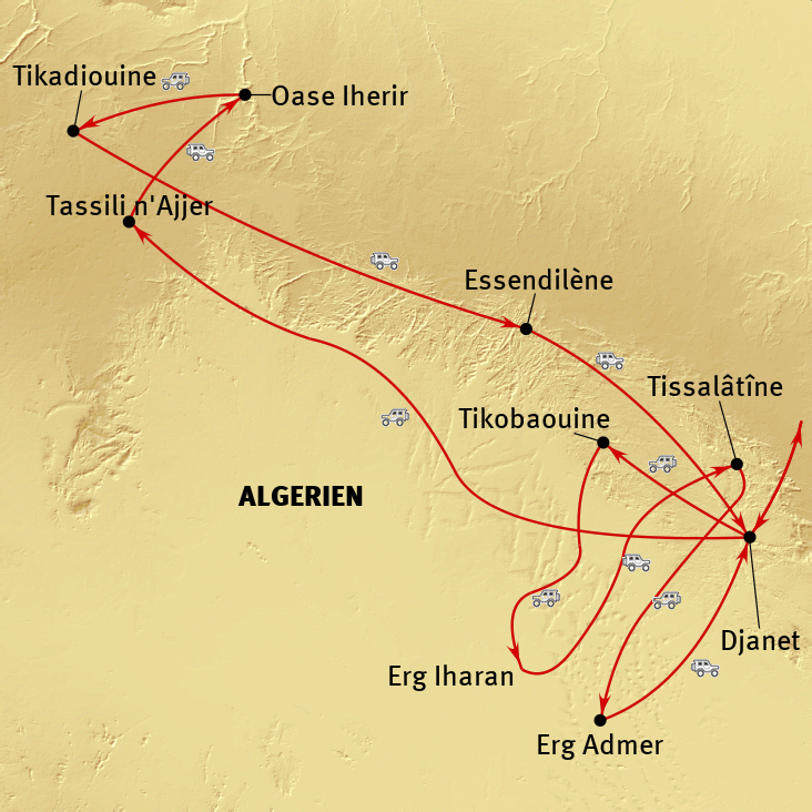 - Auf einen Blick Geländewagenreise durch die Sahara mit dem Tassili n´Ajjer Nationalpark, der Oase Iherir, der Schlucht von Essendilène, den Ergs Iharan und Admer