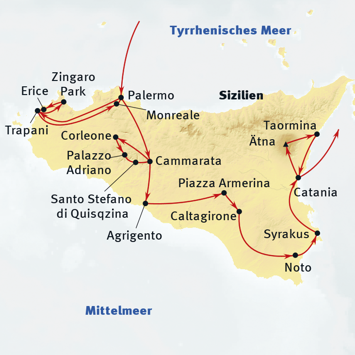 Sizilien, die größte Insel Italiens und des Mittelmeeres, ist das Überbleibsel einer Landbrücke zwischen Europa und Afrika. Durch diese besondere Lage war Sizilien schon früh ein begehrtes Ziel. Auf der Insel sind antike Spuren von Griechen, Römern, Arabern, Normannen und Spaniern zu finden. Der Zauber Siziliens zeigt sich in archäologischen Funden wie dem Tal der Tempel in Agrigento. Die Landschaft reicht von sanften Hügeln bis zum Ätna. Die Nordküste hat beeindruckende Steilküsten, im Süden gibt es flache Strände. Sizilien bietet Naturerlebnisse auf Wanderwegen und eine erstklassige Küche mit einheimischen Produkten. Eine Reise hierher ist eine Natur- und Genussreise, die alle Sinne fasziniert.