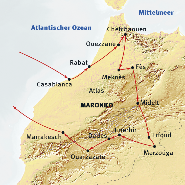 - durchgehende, deutsch spr. Reiseleitung ab Casablanca/bis Marrakesch und zusätzlich lokale, deutsch spr. Reiseleitung in den Städten