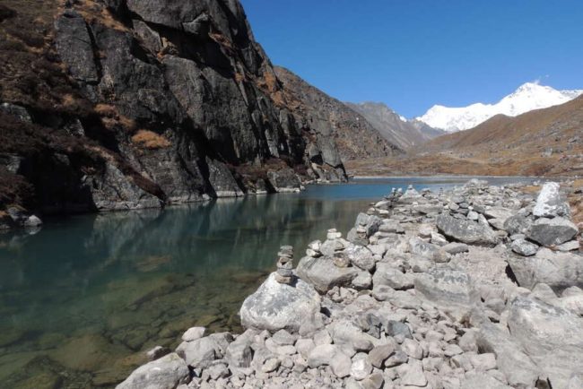 Bald erreichen wir mit Pangka (4.450 m) die letzte ganzjährig bewohnte Siedlung auf unserer Route. Über eine Brücke queren wir einen reißenden Bach und erreichen den ersten Gokyo-See. Am zweiten tiefblauen See vorbei wandern wir sanft ansteigend bis zur Alm Gokyo (4.750 m) am Ufer des dritten Sees. Hier bleibt Zeit zum Ausruhen und Energie tanken. Eine einfache Lodge dient uns als Quartier. Wer möchte, kann in wenigen Minuten zur Seitenmoräne des Ngozumpa-Gletschers aufsteigen und die Rundsicht genießen. Sehr imposant sind der langgezogene, vereiste Kamm zwischen dem Cho Oyu (8.201 m) und dem Gyachung Kang (7.922 m) sowie der Blick in die bizarre Gletscherwelt und auf unser morgiges Bergziel. (F, A)