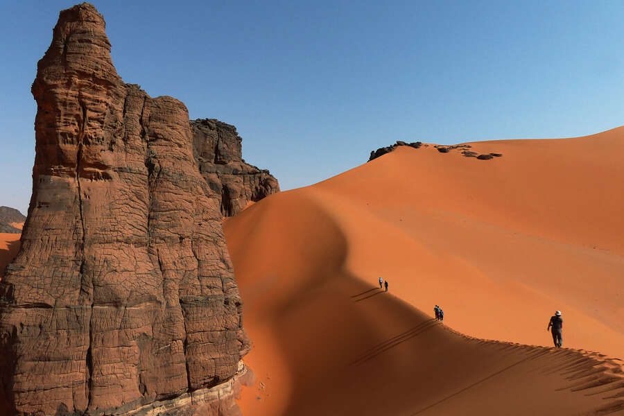 Heute steht eine erste längere Wanderung auf dem Programm, die uns die Vielfalt der Wüstenregion eindrucksvoll näherbringt. Das Tadrart, Teil des Tassili n´Ajjer Nationalparks und UNESCO-Weltkulturerbe, ist ein geneigtes Sandsteinplateau, das seit Millionen Jahren den Einflüssen von Wind und Wetter ausgesetzt ist. Die hauptsächlich von Wasser verursachte Erosion hat das Plateau zerrissen und zersägt und eine wilde Fels-Sand-Landschaft aus Klippen, Felspfeilern und Dünen entstehen lassen. Auf unserer heutigen Wanderung überqueren wir zunächst die Dünenkette hinter unserem Camp. Anschließend laufen wir hinunter in eine ausgedehnte Tonpfanne und nähern uns größeren Felspfeilern im Norden. Gegen Mittag erreichen wir unser nächstes Camp, in dem wir zwei Nächte bleiben werden. Nach dem Mittagessen und einer Siesta haben wir Zeit, uns individuell in der schönen Region zu bewegen, um weitere Wüsteneindrücke zu genießen. (F, M, A)