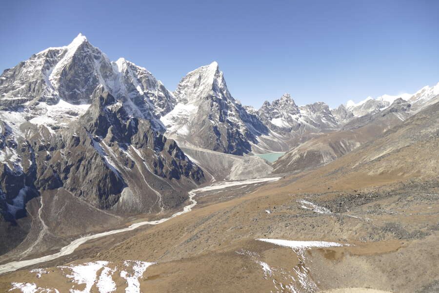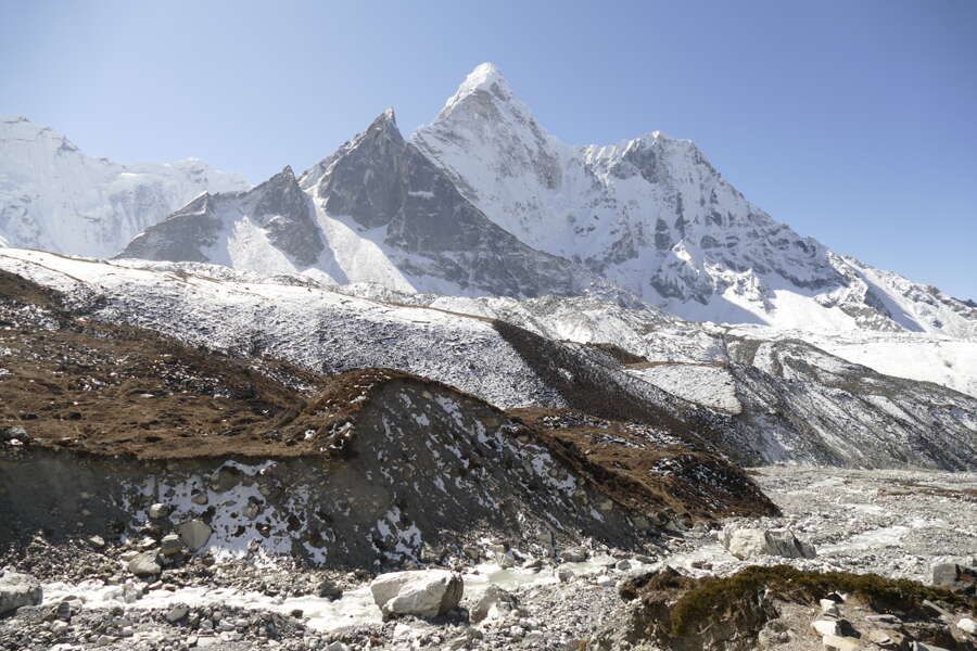 Nur kurz ist der Anstieg zu einem Chörten, der einen Blick ins Chukhung-Tal eröffnet. Über den Höhenweg oberhalb des Pheriche-Tales wandern wir gemütlich zum Gletscherfluss des Khumbu-Gletschers. Wir rasten im Weiler Duglha (4.620 m) unterhalb der Endmoräne und meistern dann das anstrengende Steilstück über die alte Moräne bis zu den Gedenkschreinen für verunglückte Bergsteiger und Sherpa. Weiter geht es in der Mulde zwischen den Lobuche-Bergen und der Khumbu-Seitenmoräne leicht ansteigend bis zu den einfachen Lodges von Lobuche (4.910 m). (F, A)