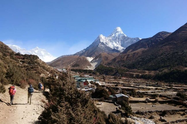 Ein wunderbarer Höhenweg führt uns, abseits der Hauptroute zum Everest Base Camp, über den Mon La (3.973 m) hinunter zum Eingang des Gokyo-Tals, wo wir den Fluss über eine Brücke queren und hinauf nach Phortse gehen. Der Aufstieg nach Phortse führt durch einen schönen Rhododendronwald. Phortse liegt spektakulär in Terrassen angelegt auf einem Plateau mit grandioser Sicht hinüber zum Kloster Tengpoche, das wir auf unserem Rückweg besuchen werden. Wir verlassen Phortse, steigen weitere 200 Höhenmeter auf, und sind nun der Ama Dablam zum Greifen nah – nicht umsonst wird sie als das Matterhorn Nepals bezeichnet. Am Ende des Höhenwegs steigen wir nach Pangboche hinunter, wo wir heute übernachten. In dem Ort findet sich das älteste Sherpakloster der Region, das immer einen Besuch wert ist. Rund um den Ort werden zudem im Rahmen des von Hauser Exkursionen und der Organisation The Partners Nepal initiierten Projekts "Ein Tag – Ein Baum" abgeholzte Wälder wieder aufgeforstet. Wir statten dem Projektareal einen Besuch ab. (F, A)