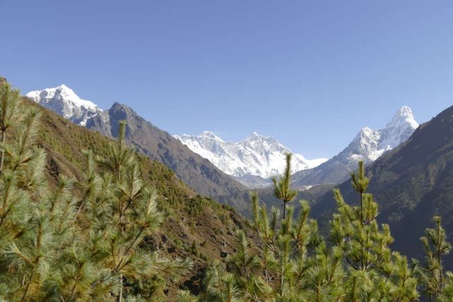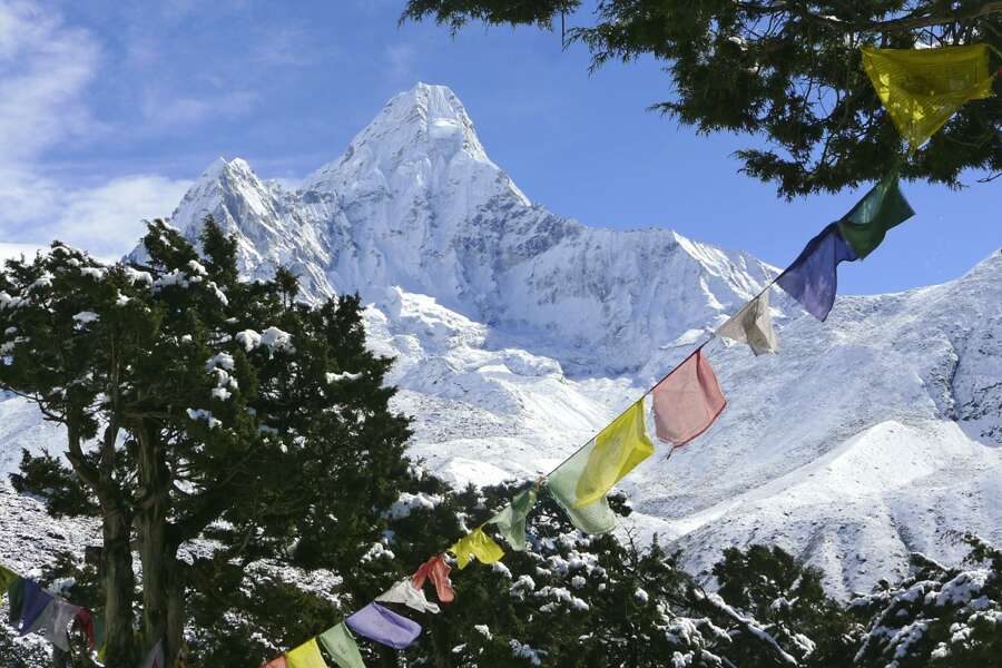 Ein wunderbarer Höhenweg führt uns, abseits der Hauptroute zum Everest Base Camp, über den Mon La (3.973 m) hinunter zum Eingang des Gokyo-Tals, wo wir den Fluss über eine Brücke queren und hinauf nach Phortse gehen. Der Aufstieg nach Phortse führt durch einen schönen Rhododendronwald. Phortse liegt spektakulär in Terrassen angelegt auf einem Plateau mit grandioser Sicht hinüber zum Kloster Tengpoche, das wir auf unserem Rückweg besuchen werden. Wir verlassen Phortse, steigen weitere 200 Höhenmeter auf, und sind nun der Ama Dablam zum Greifen nah – nicht umsonst wird sie als das Matterhorn Nepals bezeichnet. Am Ende des Höhenwegs steigen wir nach Pangboche hinunter, wo wir heute übernachten. In dem Ort findet sich das älteste Sherpakloster der Region, das immer einen Besuch wert ist. Rund um den Ort werden zudem im Rahmen des von Hauser Exkursionen und der Organisation The Partners Nepal initiierten Projekts "Ein Tag – Ein Baum" abgeholzte Wälder wieder aufgeforstet. Wir statten dem Projektareal einen Besuch ab. (F, A)
