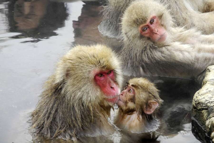 - Schneeaffen beim Bad in den heißen Quellen des Jigokudani-Nationalparks beobachten