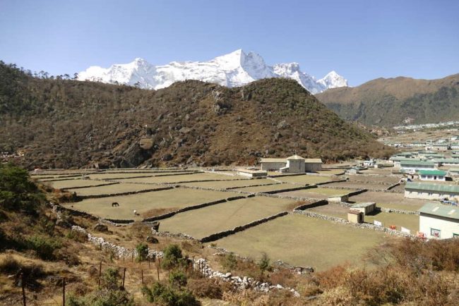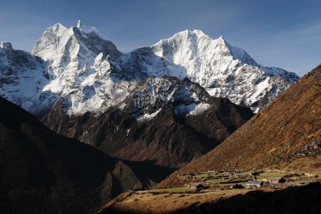 Wir wandern über den Mendaphu Hill und auf einem aussichtsreichen Hangweg hinab nach Sanasa. Von hier steigen wir weiter bergab in die tiefe Imja Kosi-Schlucht und treffen nach gut 2,5 Std. Wanderzeit in Phunga Tengi (3.250 m) ein. Nach einem 2-stündigen Aufstieg erreichen wir den Kamm von Tengboche (3.870 m). Bei klarem Wetter erfreut uns bis zum Sonnenuntergang der grandiose Ausblick auf die Eisriesen im Khumbu. Über uns thronen Gipfel wie Kongde Ri, Taboche, Mt. Everest, Nuptse, Lhotse, Ama Dablam, Kang Taiga und Thamserku. Im Weiler Deboche, nahe dem kleinen Nonnenkloster, liegt unsere heutige Lodge. (F, M, A)