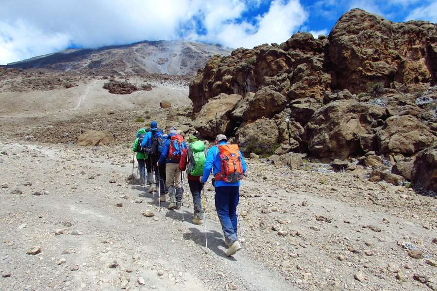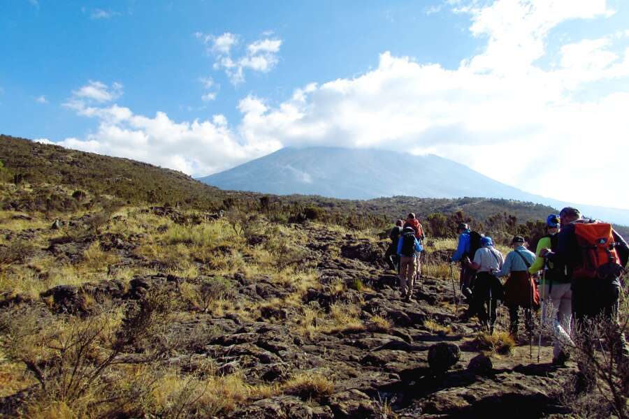 Nach dem Frühstück fahren wir auf guter Straße um den Berg herum nach Nalemoru nahe der kenianischen Grenze, dem Ausgangspunkt der Bergbesteigung. Hier erwartet uns bereits unsere Begleitmannschaft, die aus mehreren Trägern, einem Koch, einem Assistant Guide und einem Guide besteht. Die Größe der Mannschaft ist abhängig von der Gruppengröße. Wir registrieren uns im Bergbuch und dann wandern wir los. Der erste Teil der Strecke führt an Feldern vorbei, an die sich auf dieser Seite des Berges der sehr schmale Regenwaldgürtel anschließt. Wir gehen sanft bergauf. Ohne große Anstrengung erreichen wir die Baumgrenze und das Simba Camp (2.625 m). Meist stehen die Zelte schon und die Mannschaft erwartet uns mit einem heißen Tee. Wer möchte, kann nachmittags noch ein Stückchen weiter bergauf gehen - bitte mit dem Guide absprechen. (F, M, A)