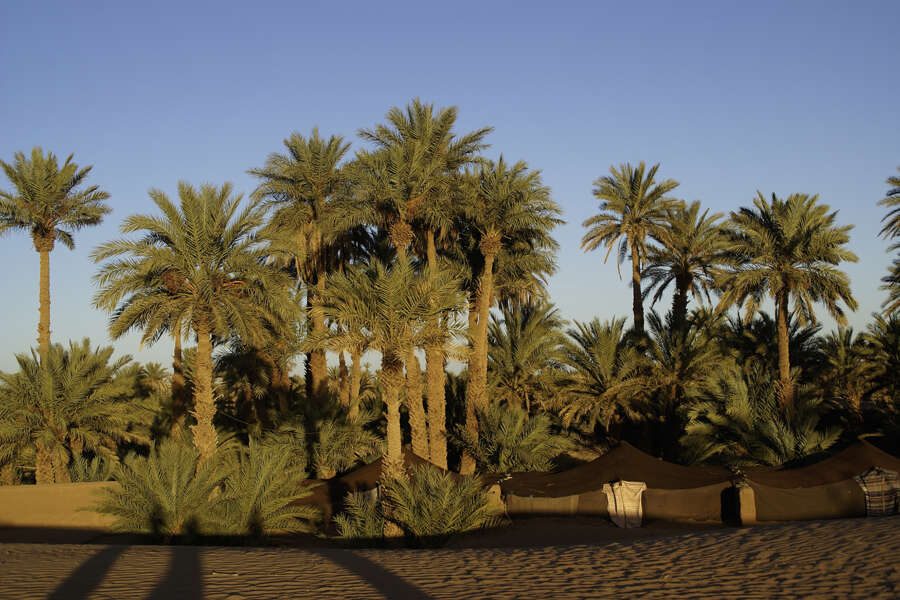 Nach dem Frühstück besichtigen wir die Kasbah Taourirt, einst Sitz der Herrscherfamilie El Glaoui. Über den Pass Tizi n'Tinifift (1.660 m) fahren wir ins fruchtbare Draa-Tal mit seinen Palmenhainen und Lehmbauten, bekannt als "Straße der 1.000 Kasbahs". Entlang der alten Karawanenroute erreichen wir Zagora, das Tor zur Wüste, und besuchen ein Sufi-Zentrum mit bedeutender Bibliothek. Am Nachmittag geht es weiter nach Mhamid, wo wir unsere Begleiter und Kamele treffen. Wir teilen uns zu zweit ein Kamel oder buchen optional ein eigenes Reitkamel hinzu. Nach einer kurzen Einführung ins Kamelreiten brechen wir nach Süden auf. Reitend oder wandernd brauchen wir etwa 90 Minuten zum ersten Wüstenlager an einer Palmenoase. (F, A)
