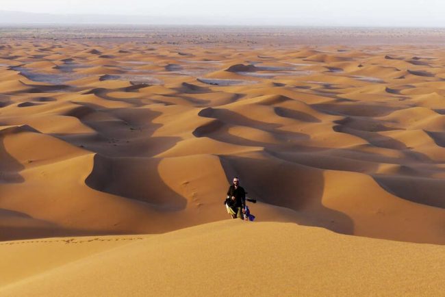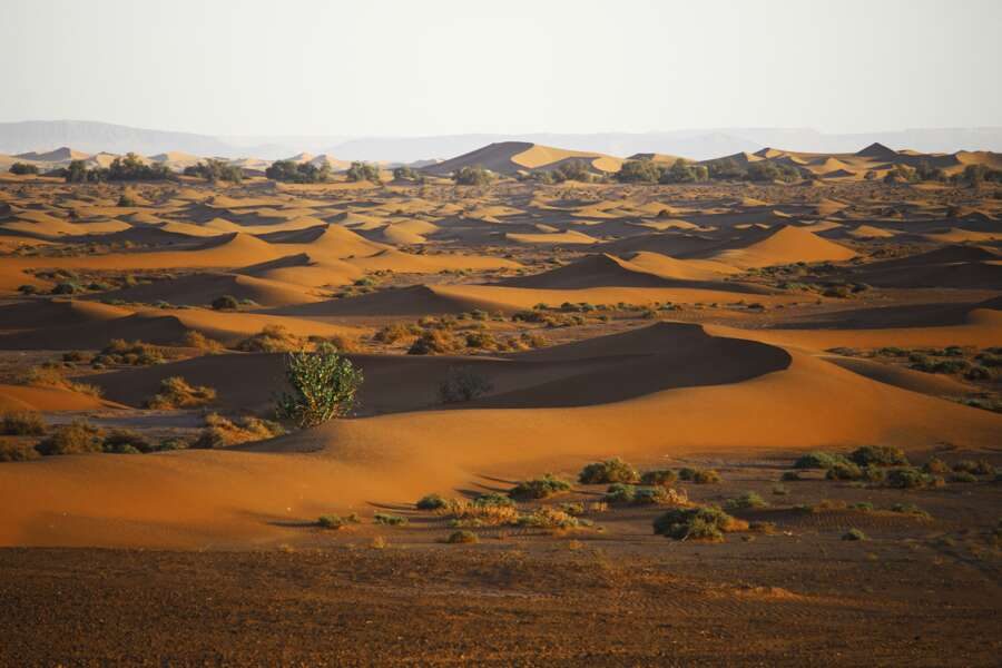 Heute geht es durch sandige Abschnitte, aber auch ab und zu über steinige Plateaus, die von kleinen Dünengebieten durchsetzt sind. Schließlich erreichen wir das Erg Zaher, wo wir von Sand in warmen Farben und harmonischen Formen umgeben sind. In der Ferne erkennen wir eine massive Bergkette, hinter der sich bereits die algerische Sahara befindet. Zum Sonnenuntergang lohnt es sich, auf eine der Dünen aufzusteigen und die Lichtstimmungen zu genießen. (F, M, A)