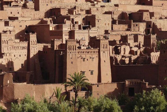 Am Morgen verabschieden wir uns von unseren Begleitern und den Kamelen. Früh treffen die Geländewagen ein und wir durchqueren die trockene Senke des Iriki-Sees. In Foum Zguid erreichen wir nach Tagen in der Wüste wieder eine bewohnte Siedlung. Wir steigen in den Bus und führen unsere Fahrt auf der Asphaltstraße über ein Oasen-Tal und mehrere kleine Bergpässe fort. Unterbrochen von einem Mittagessen in einem einfachen Lokal, erreichen und besichtigen wir das Wehrdorf Ait Benhaddou. Die großen Lehmbau-Kasbahs sind unten von Palmen umgeben und ziehen sich durch enge Gassen den Berg hinauf bis zu einem Aussichtspunkt. Anschließend fahren wir nach Ouarzazate, wo wir die Nacht verbringen. (F, M, A)