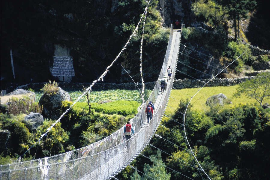 - Den Dudh Kosi, der bei den Gokyo-Seen entspringt, auf einer Hängebrücke überqueren