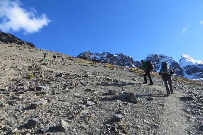 Unsere Tagesetappe hält heute zwei anstrengende Pässe für uns bereit. Haben wir den ersten auf ca. 4.950 m erreicht, steigen wir zunächst auf ca. 4.630 m ab – und anschließend zum zweiten wieder auf ungefähr 4.800 m auf. Die heutige Trekkingetappe ist sicherlich die anspruchsvollste und anstrengendste. Durch ein wildes, einsames Tal gelangen wir zur türkis schimmernden Laguna Lliviñosa (ca. 4.250 m) und kommen dem eindrucksvollen Gipfel des Sechstausenders Huayna Potosi immer näher. Die vielen Höhenmeter im Abstieg verteilen sich auf mehrere, nur selten etwas steilere Passagen. Schließlich erreichen wir unseren Lagerplatz im Tal von Ancohuma (ca. 3.850 m). (F, M, A)