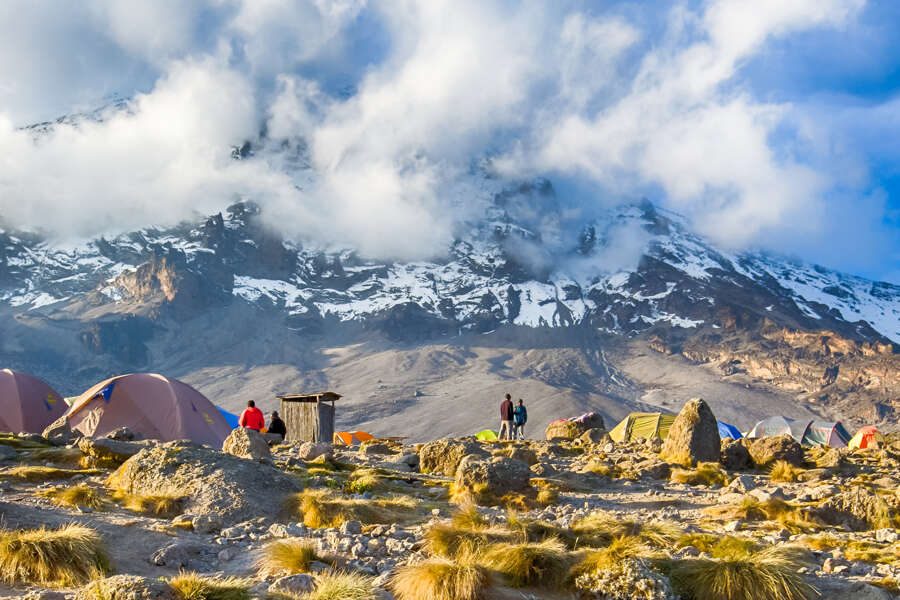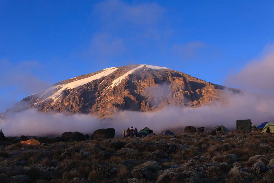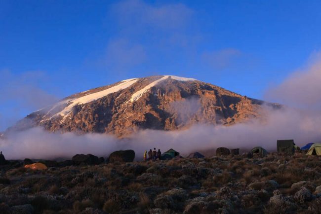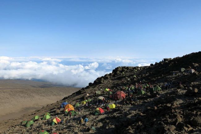 Die bisher dominierende Moorlandschaft wird beim weiteren Aufstieg allmählich endgültig von der kargen Steinwüste abgelöst. Nach guten 3 Stunden Gehzeit erreichen wir das Barafu Camp (4.673 m). Am Nachmittag können wir noch eine Akklimatisierungstour zum Kosovo Camp (4.800 m) machen. Beim frühen Abendessen sollten wir möglichst viel essen, damit wir für die Gipfelnacht gestärkt sind. Die Nacht ist sehr kurz, weshalb wir nach dem Abendessen in die Zelte kriechen, um die bevorstehende Gipfeletappe möglichst erholt in Angriff nehmen zu können. Gegen 23 Uhr stehen wir schon wieder auf und machen uns bereit für den letzten Aufstieg. (F, M, A)