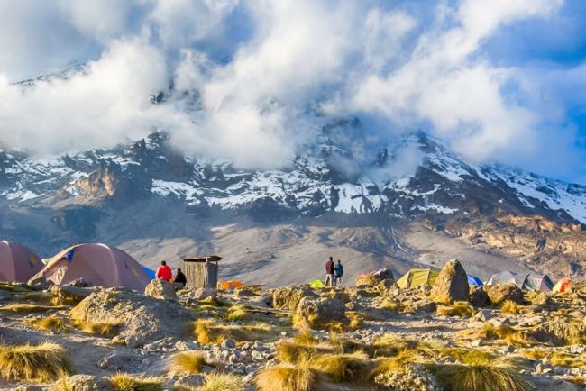 Nach einer halben Stunde Gehzeit steht uns die anstrengendste Etappe des heutigen Tages bevor, die Barranco Wall. Aus der Ferne sieht die Passage aus, als müsste man sie kletternd überwinden. Dort angekommen, entpuppt sich die Barranco Wall als weniger schwierig, dennoch ist absolute Konzentration, Trittsicherheit und Schwindelfreiheit erforderlich. Die nächsten ca. eineinhalb Stunden geht es in felsigen Serpentinen steil hinauf, wobei man ab und zu die Hände zur Hilfe nehmen kann. Nach dem Aufstieg haben wir uns eine Pause verdient, sammeln Kräfte und genießen den einmaligen Blick auf die drei Südgletscher des Kibo. Wir folgen dem Southern Circuit in ca. 2 Stunden in stetigem Auf und Ab zu unserem heutigen Tagesziel, dem Karanga Camp (3.395 m). Am Nachmittag machen wir noch eine Akklimatisierungstour. (F, M, A)