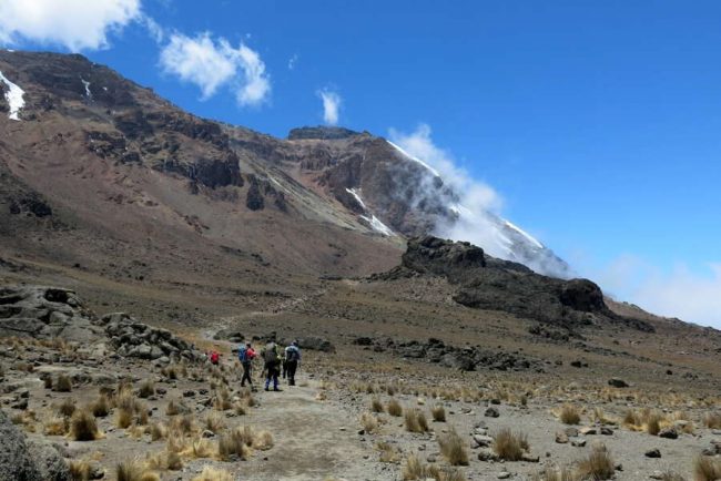Der Pfad führt ständig ansteigend durch Hochmoorlandschaft, oft über Wurzelwerk, ist jedoch im Allgemeinen trockener und felsiger als am Vortag. Obwohl wir langsam gehen, gewinnen wir rasch an Höhe, da der Weg nun steiler wird. Die Büsche werden niedriger und es eröffnen sich Weitblicke in die weite Ebene und hinüber zum Mount Meru. Auf ca. 3.400 m erreichen wir eine Ebene, auf der wir Mittagspause machen. Ab hier finden sich kaum noch größere Pflanzen und allmählich erreichen wir die alpine Wüste. Wir laufen durch schwarzen Lava-Sand. Die gesamte Breite des Kibo ist von diesem Plateau aus zu sehen. Links die Lent Group, oberhalb der Gardner Glacier, die Western Breach bis zum Heim Glacier mit der Breach Wall. Gegen Westen öffnet sich das Plateau und der gesamte Kamm mit dem Klute Peak (3.955) ist sichtbar. Schließlich erreichen wir das Shira Cave Camp auf 3.750 m. Je nach Ankunft am Camp und Kraftreserven machen wir am Nachmittag noch eine Akklimatisierungswanderung zur Shira Höhle. (F, M, A)