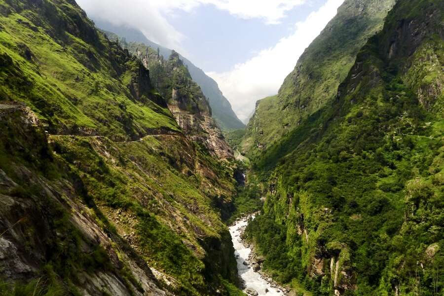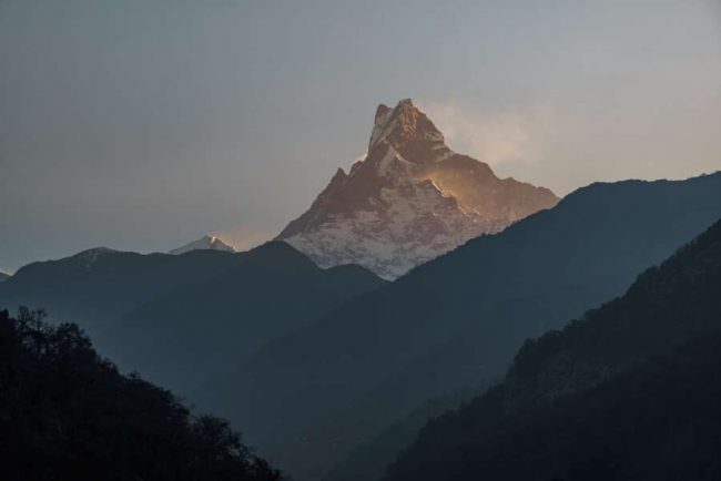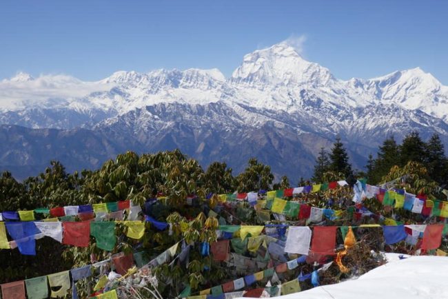 Im Schein unserer Stirnlampen steigen wir am Morgen auf zum Poon Hill und bewundern, wie die Bergwelt zum Sonnenaufgang langsam in Licht getaucht wird. Zum Frühstück sind wir zurück in Ghorepani. Dann geht es weiter auf einem aussichtsreichen Kammweg zum Weiler Deurali (2.990 m). Nach dem Mittagessen steigen wir auf schmalen Pfaden in den Rhododendron- und Bambus-Dschungel zu den Häusern von Banthanti ab, um bald danach im Urwald emporzugehen nach Tadapani (2.690 m). Zuletzt geht es steil hinab nach Ghandrung (1.940 m). (F, A)