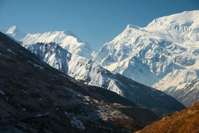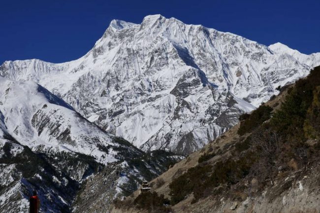Heute Vormittag bringt uns eine kurze Fahrt per Jeep oder Kleinbus nach Marpha. Damit überbrücken wir einen für Trekking unattraktiven Abschnitt. Nach einem Rundgang durch Marpha (2.650 m) wandern wir von hier aus durch die nun schroffe Landschaft des Kali-Gandaki-Tals. Auf dem weniger begangenen Weg an der Ostseite des Flusses, mit tollen Ausblicken zur Dhaulagiri-Kette, wandern wir bis zum Ort Sauru, wo wir Mittagspause machen. Bei klarem Wetter bieten sich immer wieder herrliche Aussichten auf die gewaltigen Steilwände des Dhaulagiri im Westen und auf den Nilgiri im Osten. Kurz hinter Sauru verengt sich das weite Kali Gandaki-Tal, und abrupt lassen die starken Winde nach. Über Kokethanti erreichen wir Kalapani (2.500 m). Hier sind wir nun genau an der Stelle zwischen den Achttausendern Dhaulagiri und Annapurna, die das tiefste Tal der Welt markiert. (F, A)