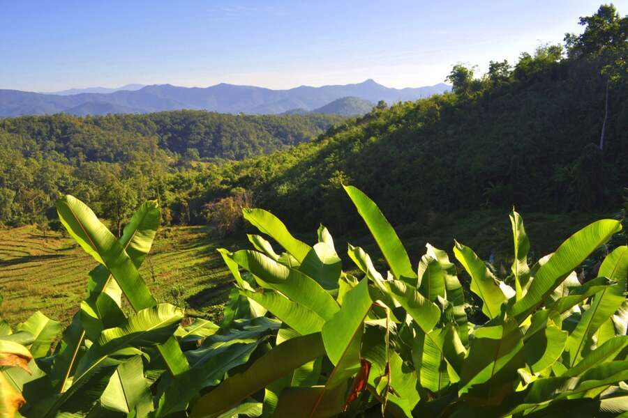 Der Tag beginnt heute sehr früh. Nach einem morgendlichen Kaffee oder Tee radeln wir in den Sonnenaufgang und erreichen den lebhaften Markt in einem Dorf bei Phrao. Wir stöbern in Ruhe durch die frischen Angebote und kaufen einige Blumengirlanden, die wir später im Dorftempel als Opfergabe überreichen. Danach geht es zurück zur Lodge, wo uns ein stärkendes Frühstück erwartet.Frisch gestärkt fahren wir ein kurzes Stück zum Ausgangspunkt für unsere heutige Wanderung. Wir wandern zu einem Wasserfall und wer möchte kann sich im kühlen Nass erfrischen. Mittags helfen wir unserem Guide bei der Zubereitung eines speziellen Gerichts, gekocht in Bambus. Nach der Mittagspause geht es weiter durch Dörfer, Reisfelder und vorbei an Obstfeldern. Am Abend genießen wir ein letztes gemeinsames Abendessen in unserer Lodge. (F, M, A)