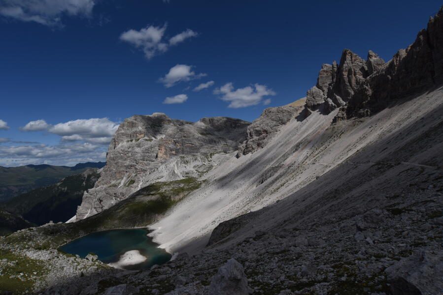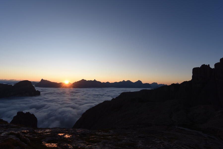 Den mächtigen Langkofel im Blick steigen wir über Almwiesen bergab nach Wolkenstein. Mit der Seilbahn fahren wir auf 2.800m und erreichen in wenigen Kilometern die Jimmi-Hütte, wo wir die Mittagsrast bei hervorragender Südtiroler Küche genießen. Gestärkt machen wir uns auf den zweiten Teil unserer heutige Etappe, der uns ein kurzes Stück bergab zum Grödner Joch führt. Auf der anderen Seite des Übergangs führt der Weg zuerst flach auf einem Felsband an den Sellastock heran, anschließend um den Brunecker Turm zum Mittagstal, welches uns in einem stetigen Anstieg hinauf zu einem wahren Juwel der Dolomiten führt - dem Lago de Pisciadù. Bei sommerlichem Wetter lädt der See nach dem anstrengenden Aufstieg zu einem kühlen Bad in 2.570 m Höhe ein. Unsere heutige Unterkunft liegt direkt am See, eingebettet zwischen den hohen Gipfeln der Sella-Gruppe mit freiem Blick zum Sonnenaufgang. (F, A)