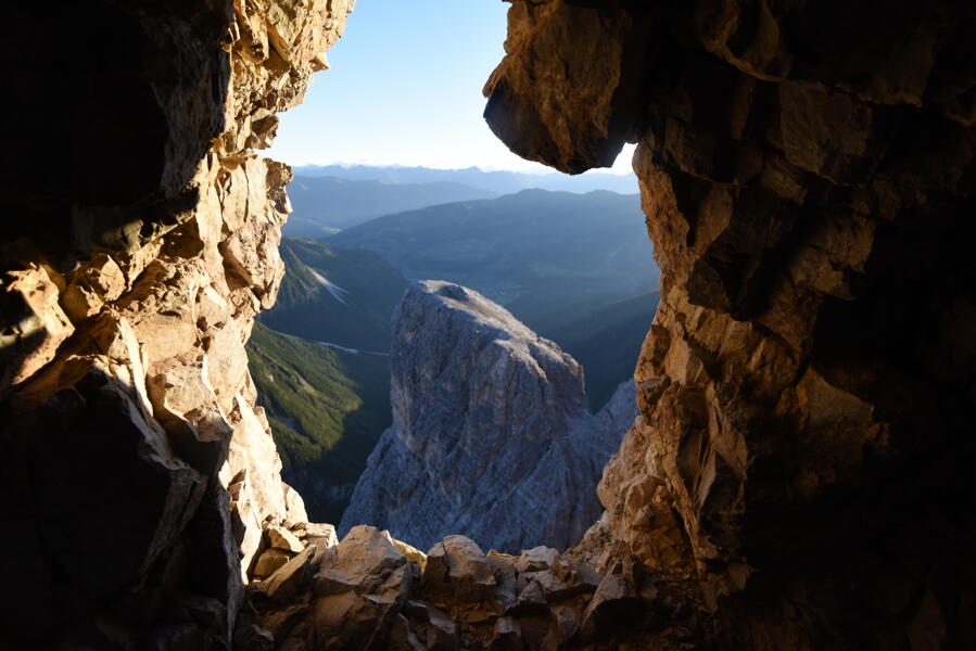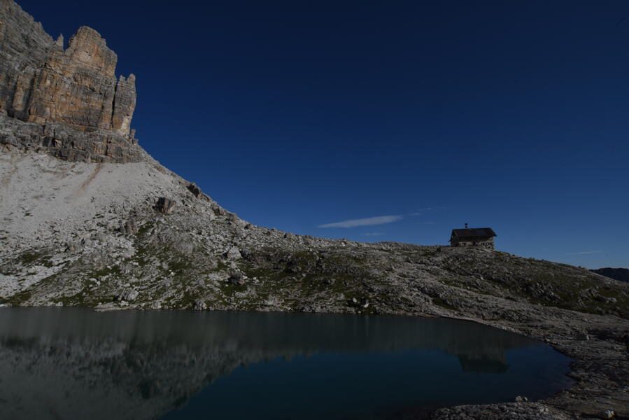 Wir wandern am Ostufer des Seens in Richtung Passo Falzareggo. Mit der Seilbahn fahren wir auf 2.752 m und genießen auch hier den atemberaubenden Panoramablick, den die Südtiroler Dolomiten uns immer wieder bieten. Je nach Wetterlage wandern wir zur Forcella Lagazuoi hinunter und nahezu horizontal zur Forcella Travenanzes oder können, bei guten Bedingungen, alternativ den über 1.000 m langen Kriegsstollen im Inneren des Lagazuoi hinunter steigen (+1h und 200 Hm ↑↓). Von der Forcella beginnt unser paradiesischer Teil der heutigen Etappe, hinein ins Val Travenanzes, eines der tiefsten und einsamsten Dolomitentäler. Anfangs noch über weite Hänge, führt uns der Weg bald hinein in dunkle Wälder zwischen den Dreitausendern des Monte Cavallo und der Tofana. Nach einer langen flachen Geröllwanderung wird das enge Tal wieder steiler und bietet in mehreren Gumpen ideale Bademöglichkeiten. Das Tal verengt sich schluchtartig weiter, bevor es sich öffnet und uns ins Fanestal entlässt. Ein letztes Mal überqueren wir an der Ponte Óuto die tief eingeschnittene Schlucht des Rio Travenanzes. Nur noch ein kurzes Stück auf breiten Wegen trennt uns von unserem Treffpunkt mit unserem Taxi. Wir fahren hinüber nach Misurina und von hier per Jeep weiter zum Rifugio Angelo Bosi. Sollte noch Zeit blieben, haben wir die Möglichkeit uns in dem Freilichtmuseum des Monte Piano einen ersten Einblick dieses historischen Ortes zu verschaffen. (F, A)