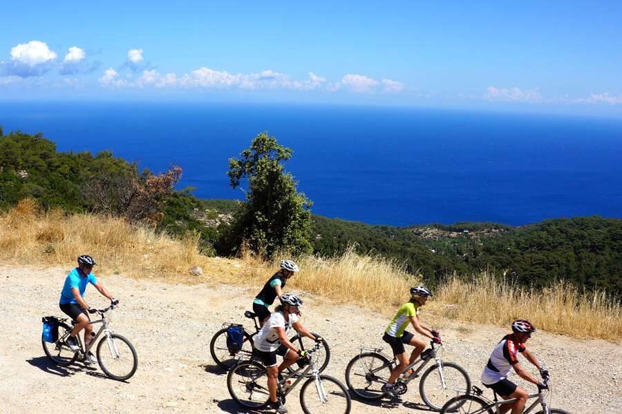 Wahlweise mit dem Rad oder dem Begleitbus fahren wir zu dem auf einer Hochebene (400 Höhenmeter) gelegenen Bergdorf Christos Raches. Nach einer Rast auf dem schönen Dorfplatz radeln wir durch dichte Kiefernwälder, vorbei an einem idyllischen Stausee zum Kloster Montetis Evangelistrias. Auf einer Panoramastrasse parallel zur Nordküste durchqueren wir die Hochebene in Richtung Osten. Belohnt mit grandiosen Ausblicken und einer wunderschönen Abfahrt erreichen wir über die blumengeschmückten kleinen Bergdörfer Frantato und Dafni die Hafenstadt Evdilos. Nach der Mittagspause fahren wir entlang der Küstenstraße zurück nach Armenistis und zum Baden an den Mesaktibeach. (F)