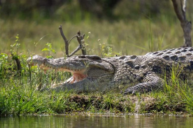 - Am Flussufer auf Beute lauernde Krokodile betrachten