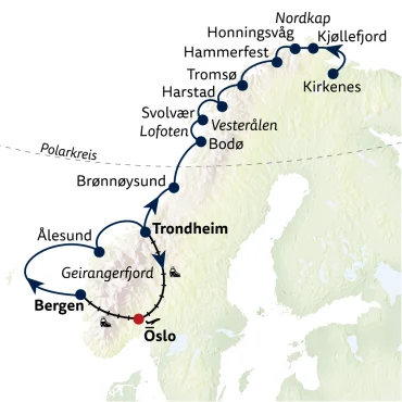 Erleben Sie Norwegens Vielfalt per Schiff und Bahn: Von Kiel über Oslo und Bergen bis zum Nordkap und zurück. Freuen Sie sich auf spektakuläre Fjorde, charmante Städte und unvergessliche Naturmomente entlang der faszinierenden Küste.