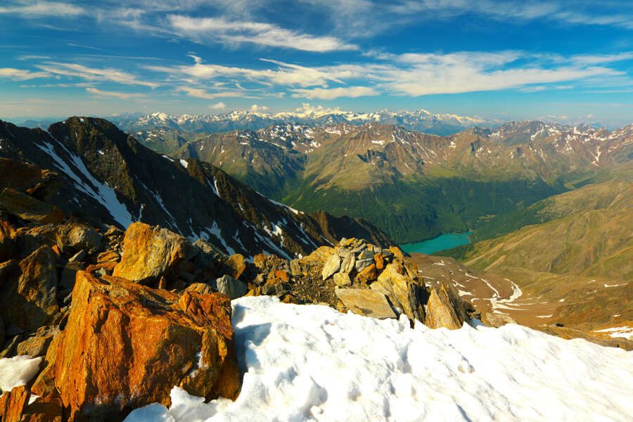 Wir beginnen den Tag mit einem leicht ansteigenden Karrenweg, der uns zur Martin-Busch-Hütte bringt. Optional kann das Gepäck im Hotel abgegeben und zur Hütte gefahren werden. Angekommen an der Hütte gönnen wir uns eine kurze Pause, bevor es durch ein weit ausgewaschenes Gletschertal ein letztes Mal bergauf geht. Wir wandern unterhalb der mächtigen Similaun-Gletscherzunge hinauf zum Niederjoch (3.012 m) und kehren ein letztes Mal am Berg, in der am Pass gelegenen Similaunhütte, ein. Ganz in der Nähe liegt die berühmte Fundstelle des "Ötzi", dem Mann aus dem Eis. Frisch gestärkt beginnen wir unseren landschaftlich schönen Abstieg ins Schnalstal. Über blühende Wiesen und vorbei an uralten Bergbauernhöfen gelangen wir zum Vernagt-Stausee. Von hier bringt uns ein Taxi durchs schöne Vinschgau direkt nach Meran, wo ein komfortables Hotel und ein Hauch Südtiroler Dolce Vita auf uns warten. (F, A)