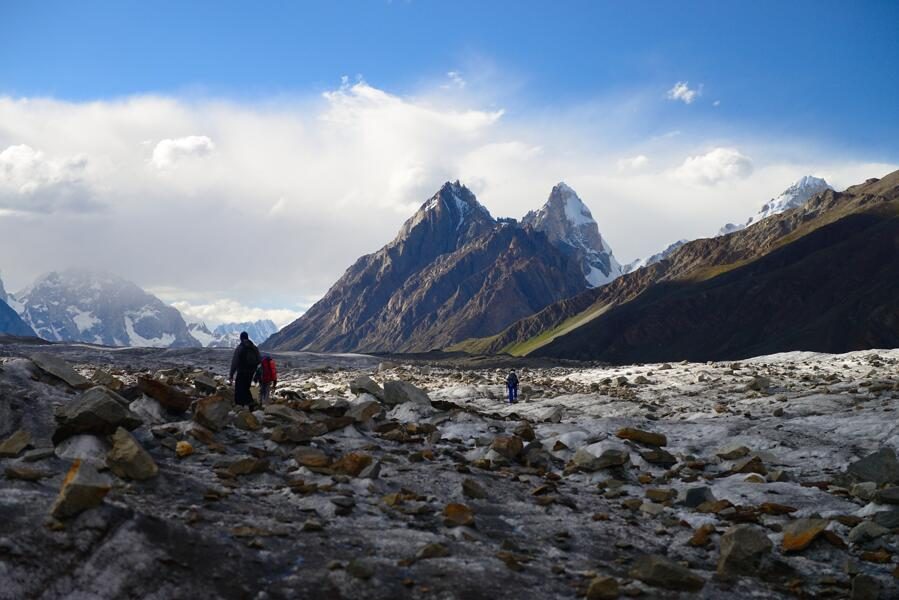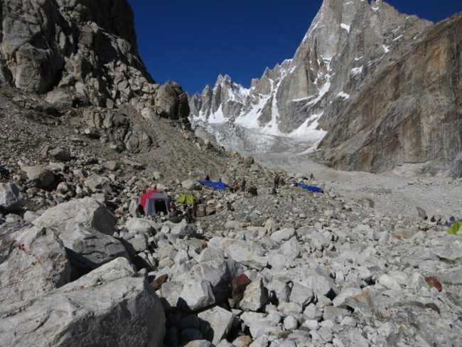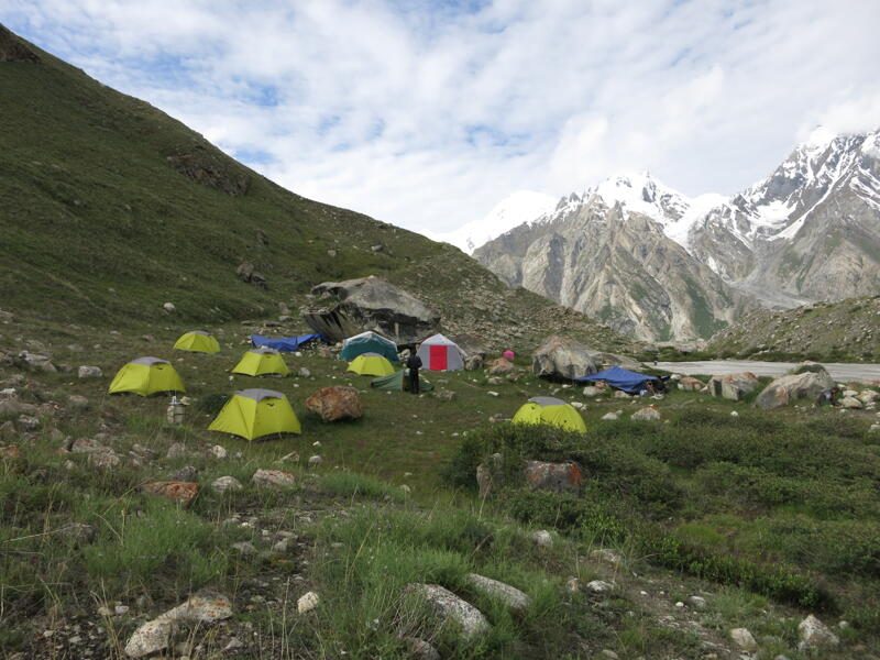 Weiter geht es über den Gletscher und loses Gestein oder blankes Eis hinauf. In der Gletschermitte gestaltet sich das Vorankommen auf einer breiten Eisstraße recht einfach. Unterwegs sehen wir auch schon die mächtigen Gipfel der Latok-Gruppe, deren höchste Spitze 7.145 m misst. Nach Querung zum rechten Gletscherrand, schlagen wir unserer Lager auf ca. 3.980 m wieder auf einer Grasfläche auf. (F, M, A)