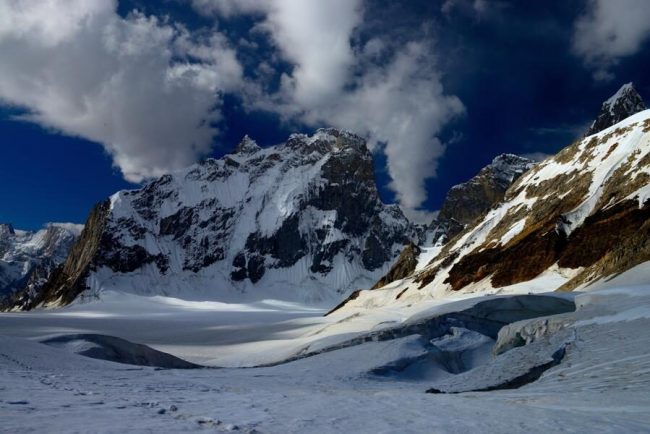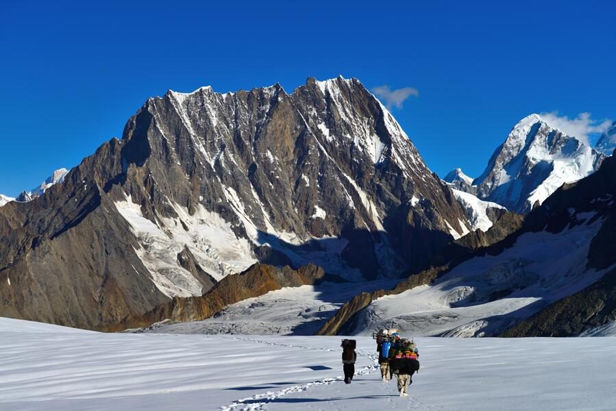 Heute bahnen wir uns den Weg über den Yutmaru-Gletscher. Spektakuläre Ausblicke gibt es immer wieder zurück auf den Hispar-Pass und, wenn das Wetter mitspielt, erblicken wir auch den Kunyang Chish, mit 7.852 m einer der höchsten Karakorum-Gipfel. Am Nachmittag erreichen wir das auf einer Wiese gelegene Camp Bhitanmal. (F, M, A)