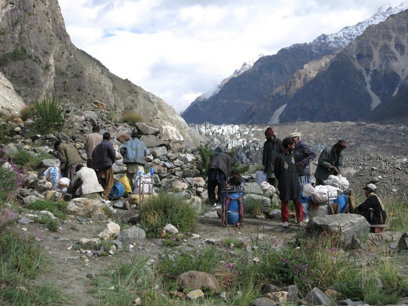 Noch einmal heißt es einen Gletscher queren, diesmal den Khunyang-Gletscher. Der Weg verläuft steil an der Seitenmoräne entlang. Wir gelangen schließlich zu den Hochweiden von Faling Chhish, wo die Bauern der Ortschaft Hispar im Sommer ihre Viehherden weiden lassen. (F, M, A)