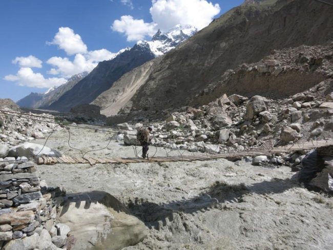 Unser Weg führt weiter das Tal hinunter. Im Süden sieht man nun die Gletscher- und Felsabbrüche des Spantik, ein sehr schöner und oft bestiegener Siebentausender. Wir überqueren eine Brücke über den Fluss Hispar, und erreichen schließlich das gleichnamige Dorf auf ca. 3.400 m, wo wir zum letzten Mal unsere Zelte aufbauen. (F, M, A)