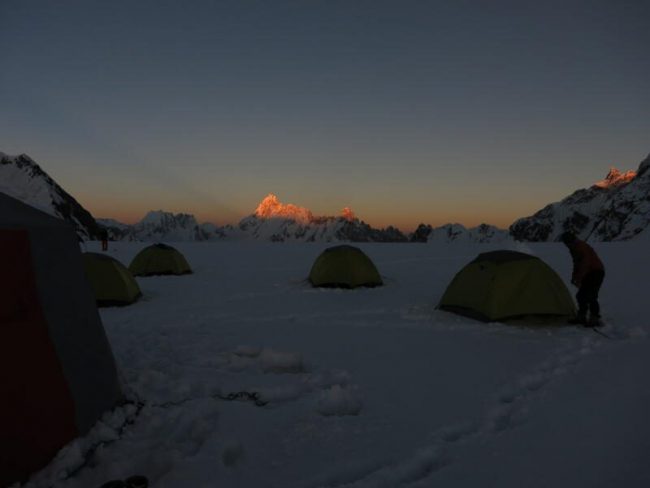 Wir verabschieden uns von der grünen Oase Baintha. Ab jetzt werden wir uns für die nächsten Tage nur noch umringt von Eis und Fels bewegen. Nachdem wir den Weg zurück auf den Gletscher gemeistert haben, gestaltet sich das Gehen auf dem Gletscher wieder recht komfortabel. Wir müssen allerdings auf Spalten achten und gehen daher je nach herrschenden Bedingungen meist in Seilschaft. Unterwegs bietet sich uns in einem Seitental ein toller Blick auf den Baintha Brakk (Ogre) mit seinen 7.813 m Höhe und die Latok-Gruppe. Auf ca. 4.580 m erreichen wir schließlich unseren Lagerplatz. (F, M, A)