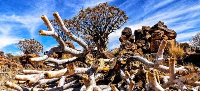 Es geht es nach Süden zum Fish-River-Canyon, dem zweitgrößten der Welt. Unterwegs hältst du beim Köcherbaumwald von Garas, der seinen Namen dem Volk der San verdankt. Die San, mit 20.000 Jahren die älteste Bevölkerungsgruppe des südlichen Afrikas, fertigten früher mit viel Geschick Köcher für ihre Pfeile aus den Hölzern der Bäume.