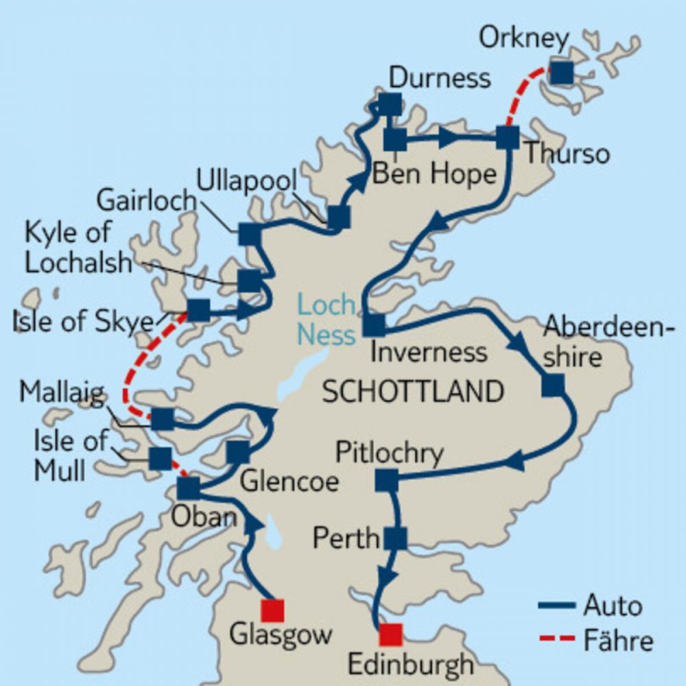 - Die Reise führt in den Nordosten Schottlands zu den Städten Wick und Thurso.