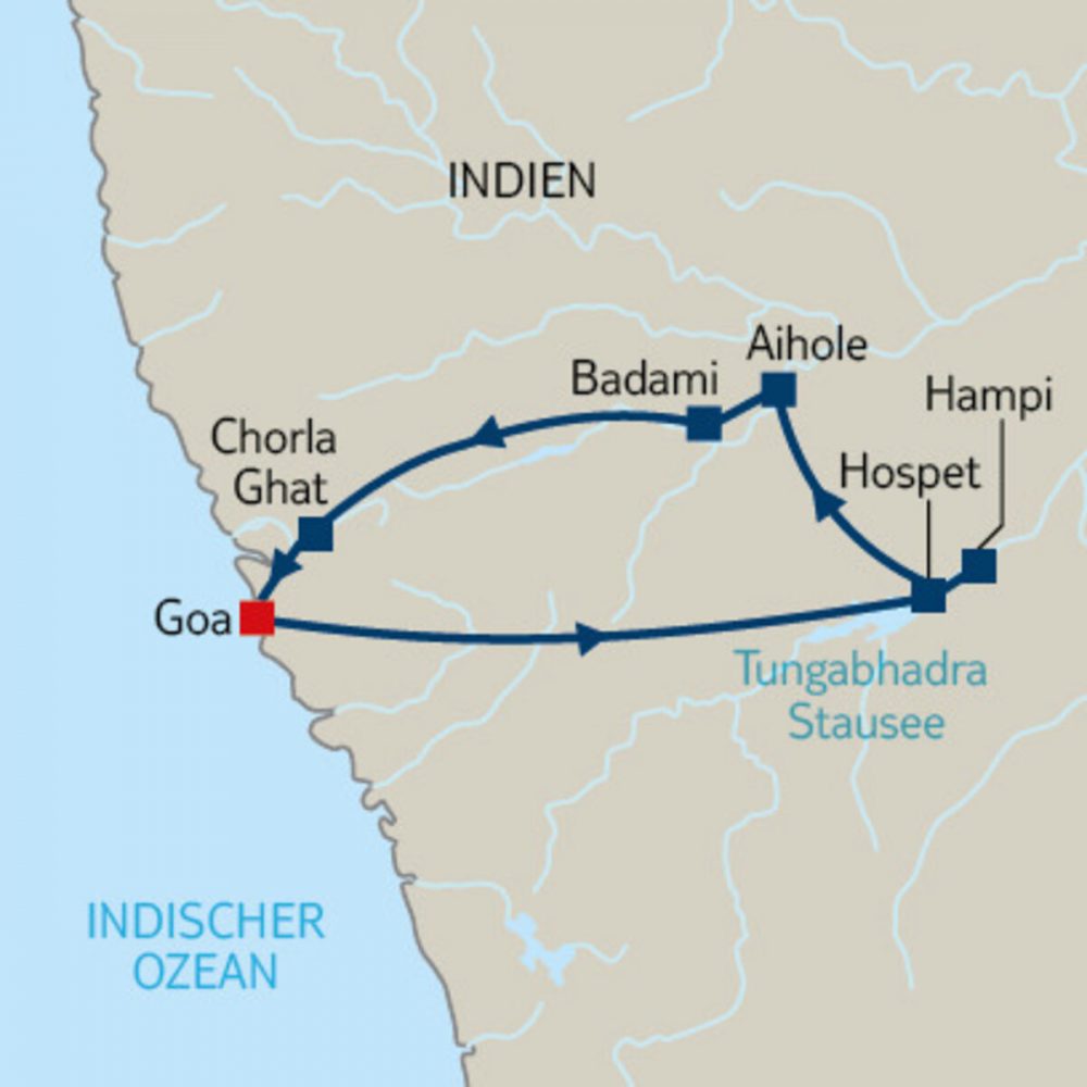 - Um 09:00 Uhr Treffen mit der Reiseleitung, anschließend Fahrt von Goa nach Hospet.