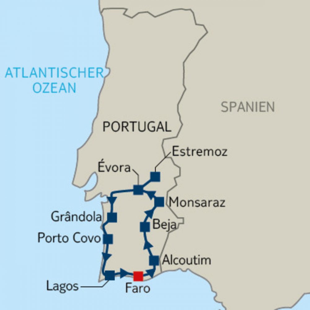 - Ende der Rundreise und Fahrt zum Flughafen sowie Abgabe des Mietwagens oder Verlängerung an der Algarve in einem unserer angebotenen Hotels.