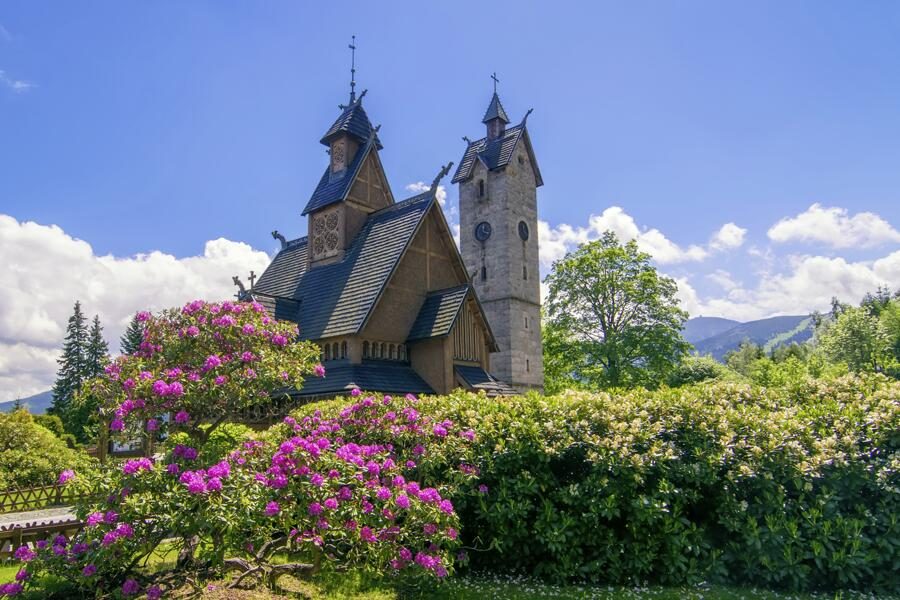 Protestantische Exilanten haben es begründet, Gerhart Hauptmann hat dort gewohnt: Wir spazieren durch Jagniatków (Agnetendorf) und besuchen das Haus des deutschen Dramatikers. Anschließend bewundern wir im Ferienort Karpacz (Krummhübel) am Fuß der Schneekoppe, die aus ihrem Winterschlaf erwacht ist, die Stabkirche Wang. Der preußische König Friedrich Wilhelm ließ sie von Norwegen nach Karpacz bringen und wieder aufbauen. (F, A)