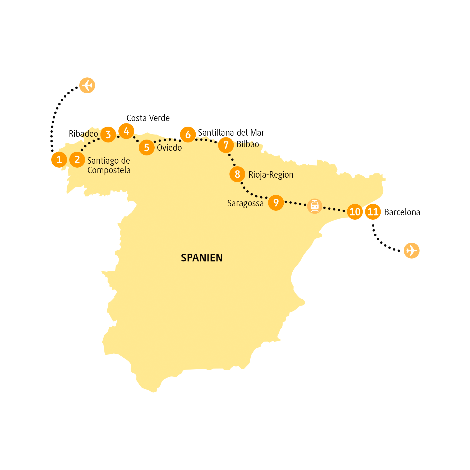 Von Saragossa geht es mit dem Schnellzug in die katalanische Hauptstadt: Am späten Vormittag heißt es: Willkommen in Barcelona und am Mittelmeer! Wir unternehmen eine Stadtrundfahrt durch die zweitgrößte Stadt Spaniens und besuchen die eindrucksvollen Bauten des Künstlers Antoni Gaudí. Unter anderem sehen wir die Sagrada Família, neben der Alhambra in Granada sicherlich das berühmteste Bauwerk Spaniens. Außerdem lernst du die die schönsten Gassen und Plätze der Altstadt kennen ehe die Führung am Nachmittag an der La Rambla endet. Die bekannteste Straße Barcelonas verbindet den Hafen und das Zentrum der Stadt. Zahlreiche Blumenverkäuferinnen, Straßenmusikanten, Akrobaten und Darstellerinnen sowie Cafés und Restaurants haben hier ihren festen Platz gefunden. Erkunde auch die bekannte Markthalle Mercat de la Boqueria. Auf einer Fläche von 2.583 Quadratmeter wird alles angeboten, was das Herz oder der Magen begehrt wie Obst, Gemüse, frisch gepresste Säfte, Fisch, Fleisch und Käse. Am hafenabgewandten Ende der Rambla befindet sich dann noch der Trinkbrunnen Font de Canaletes. Der Legende nach wird jeder, der einmal aus dem Brunnen getrunken hat, immer wieder nach Barcelona zurückkehren. Darüber hinaus hat die faszinierende Stadt am Mittelmeer noch einiges mehr zu bieten. Unsere Reiseleitung gibt dir natürlich gern ein paar Tipps. Beim gemeinsamen Abschiedsdinner am Abend kannst du ja noch einmal diskutieren, welche Stadt oder welcher Ort denn nun der Schönste war. Die Auswahl ist sicherlich nicht leicht. Dann sagst du »Hasta Pronto« zu deiner Reiseleitung, denn nach Spanien kommst du bestimmt noch mal zurück.