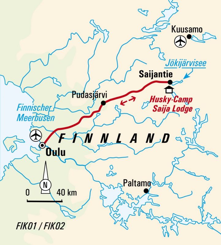 Wir fliegen nach Kuusamo, wo wir bereits von einem Fahrer der Saija Lodge erwartet werden. Mit dem Bus geht es hinaus in die finnischen Wälder, vorbei an glitzernden Seen und weiten Schneefeldern, bis wir den Jokijärvi-See erreichen. In dieser idyllischen Landschaft, unweit des Polarkreises, liegt die Saija Lodge, unser Zuhause für die kommenden Tage. Wir beziehen unsere Zimmer in den Blockhütten und richten uns gemütlich ein. Beim Abendessen genießen wir die finnische Naturküche und lernen vielleicht schon ein paar der anderen Teilnehmer kennen - ein guter Start in die gemeinsame Woche!