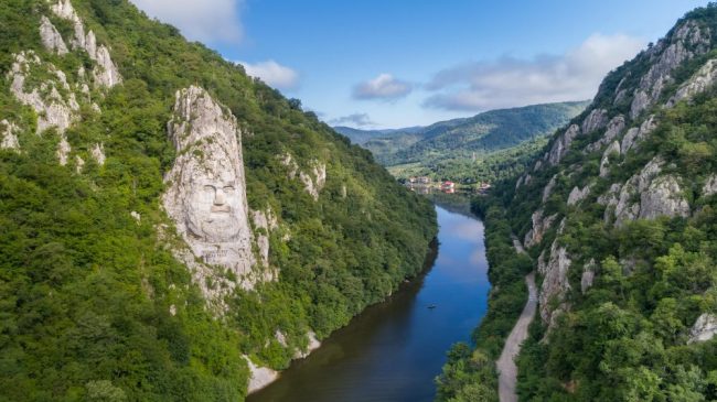 Spektakuläre Panoramafahrt durch das Eiserne Tor mit dramatischer Schluchtenlandschaft und monumentaler Decebalus-Skulptur.