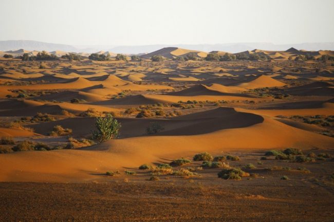 Heute kommt richtiges Wüsten-Feeling auf, denn wir sind umgeben von Sanddünen. Gegen Mittag erreichen wir das trockene Tal des Draa-Flusses und legen bei Tamarisken-Bäumen im Schatten unsere Mittagspause ein. Nachmittags wandern wir erst vorbei an einem verlassenen Oasen-Dörfchen, dessen Ruinen davon zeugen, dass die Wüste sich hier stärker ausgebreitet hat. Wir tauchen ein in einsame Regionen, die von keinem Auto mehr befahren werden können und wandern bzw. reiten direkt auf ein großes Dünenmassiv zu. An unserem Lager angekommen, haben wir die Möglichkeit, auf die höchsten Dünenkämme aufzusteigen. Von oben wird klar, dass wir uns inmitten eines unendlich scheinenden Dünenmeeres befinden, welches am Horizont von einer großen Bergkette eingerahmt wird. Nach dem Sonnenuntergang wird das Abendessen in unserem Camp im Messezelt oder unter freiem Himmel serviert.