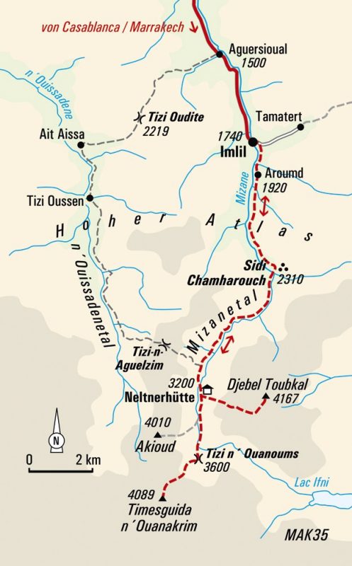 Frühmorgens steigen wir stetig, meist auf Schneefeldern talaufwärts und erreichen vorerst den Tizi n´Ougane (3.750 m, Tizi = Pass). Von dort eröffnet sich ein Ausblick auf beide Seiten der Täler und in die südlichen Bergregionen. Es folgt ein steiniger Abschnitt durch Blockgestein und Geröll bzw. Schnee. Sicherungstechnik ist nicht notwendig, es gilt jedoch, trittsicher zu sein und die Hände hin und wieder am Fels zu Hilfe zu nehmen. Wir erreichen den Vorgipfel, Ras Ouanakrim (4.083 m). Von hier ist es nicht mehr weit bis zum höchsten Gipfel des Ouanakrim-Massivs, dem sogenannten Timesguida Ouanakrim (4.089 m). Belohnung für unsere Mühe ist der weite Blick über den Toubkal in den westlichen Hohen Atlas und bei guter Sicht bis in die Sahara und den Antiatlas.
