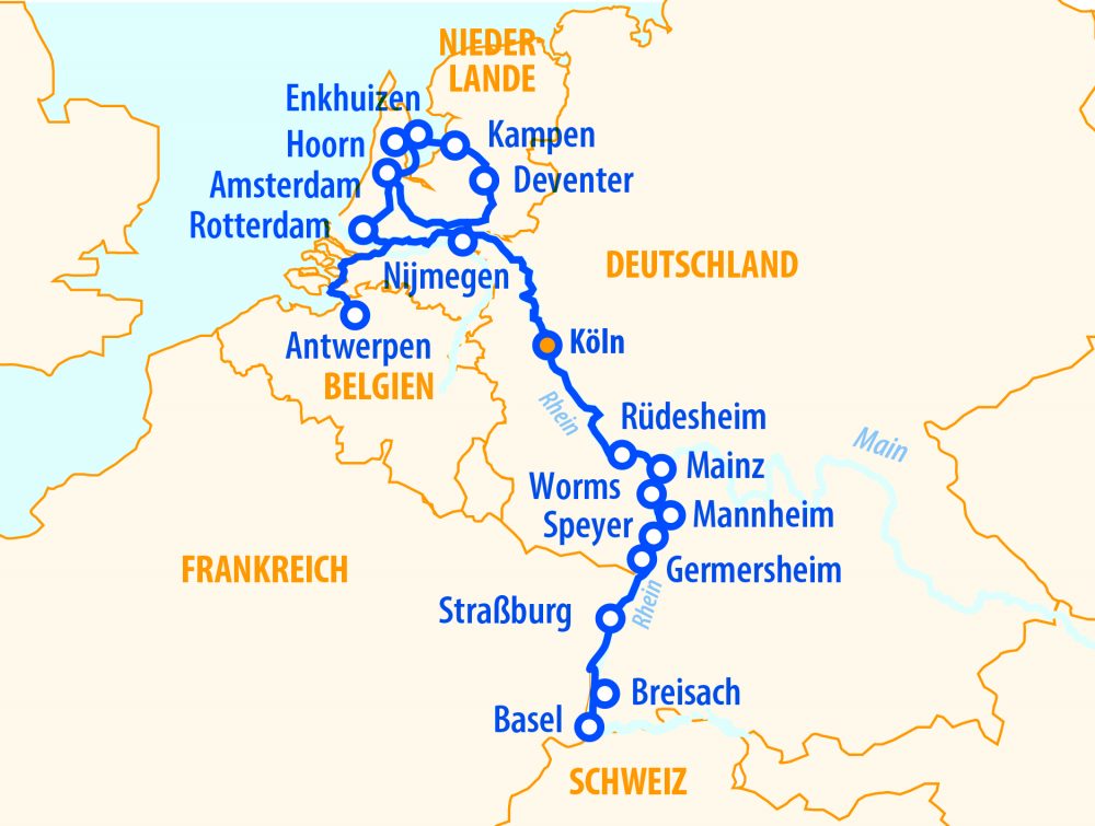 Der Rhein führt uns in 4 unserer Nachbarländer. Angefangen in den Königreichen Niederlande und Belgien, wo wir neben lebhaften Metropolen kleine historische Städte erkunden, geht es bis nach Frankreich und die Schweiz. Neben Marker- und IJsselmeer kreuzen wir durch das Obere Mittelrheintal mit seinen zahlreichen Burgen und lassen entspannt die Landschaft an uns verbeiziehen.