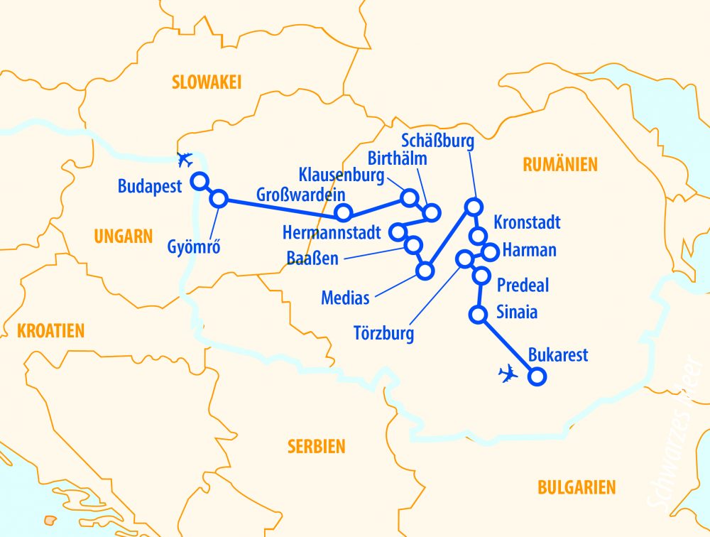 Wir entdecken Rumänien von seiner schönsten Seite: Prachtvolle Schlösser wie Peleș, geheimnisvolle Burgen wie die Dracula-Burg und mittelalterliche Kirchenburgen. In charmanten Altstädten erleben wir sächsisches Erbe, eine Fahrt im Pferdewagen bringt uns zurück in vergangene Zeiten. Zum Abschluss genießen wir ungarische Kultur und Architektur in Budapest und Umgebung.