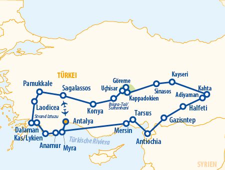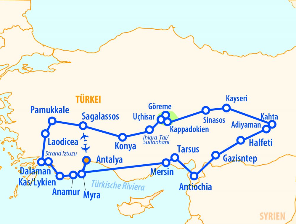 Erleben Sie auf dieser 13-tägigen Rundreise die Südosttürkei von ihrer eindrucksvollsten Seite – eine Region, in der sich jahrtausendealte Geschichte, spirituelle Orte und atemberaubende Natur vereinen. Von der lykischen Küste mit ihren Felsengräbern und antiken Städten führt die Reise bis ins Herz Mesopotamiens, ins sagenumwobene Land zwischen Euphrat und Tigris Neben kulturellen Höhepunkten wie Kappadokien, Pamukkale oder Konya erwarten Sie eindrucksvolle Naturwunder, geheimnisvolle Königsgräber und spirituelle Orte auf den Spuren des Apostels Paulus und des heiligen Nikolaus. Eine Reise voller Geschichte, Natur und Emotionen – weit abseits des Massentourismus.