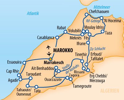 Wir entdecken Marokko auf besonderen Reiserouten und besuchen die Königsstädte Marrakesch, Rabat, Meknès und Fès sowie Casablanca. In der römischen Stadt Volubilis bewundern wir Mosaike und erkunden das blaue Chefchaouen. Durch das Rif-Gebirge gelangen wir zur Mittelmeerküste nach Al-Hoceima. Im Süden erwarten uns die Sanddünen Erg Chebbi, die Oase Merzuga, Rissani und die Todra-Schlucht. Wir bestaunen die Berber-Kasbahs in grünen Oasen vor dem Atlasgebirge und durchfahren das Dades- und Draa-Tal bis nach Zagora, dem Tor zur Sahara. Weiter geht es durch die Dattelpalmen-Oase Tata nach Tafraoute im Anti-Atlas und schließlich zum Badeort Agadir. Die romantischen Buchten der Atlantikküste führen uns zurück nach Marrakesch.