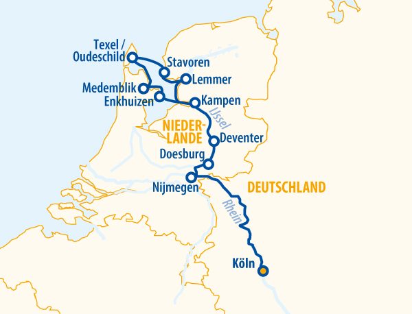 Unsere Reise führt uns weiter nach Stavoren und Lemmer, zwei charmante friesische Orte, die mit maritimem Flair und herzlicher Atmosphäre begeistern. Ein weiteres Highlight der Reise ist Kampen, von wo aus ein Ausflug nach Giethoorn, dem „Venedig des Nordens“, angeboten wird. Am Abend besuchen wir Deventer, eine der ältesten Städte der Niederlande, und genießen ihren historischen Charme. Anschließend führt uns der Weg über Doesburg zurück nach Köln.