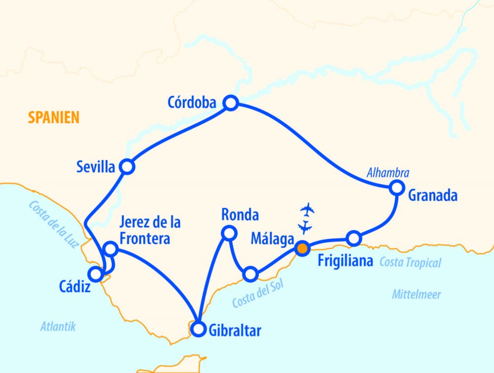 Andalusien, bekannt für seine lebendige Kultur und historischen Schätze, bietet von Festen und Tanz über köstliche Tapas bis hin zu herrlichen Stränden am Mittelmeer und der imposanten Sierra Nevada eine Fülle an Erlebnissen. Die Spuren der Phönizier, Griechen, Römer und Mauren prägen die Landschaft mit prachtvollen Palästen, Moscheen, Burgen und Kathedralen. Auf unserer umfassenden Rundreise durch Andalusien entdecken wir das lebhafte und faszinierende Südspanien, besuchen die historischen Stätten der „Katholischen Könige“ und erleben die besondere Atmosphäre von Gibraltar.