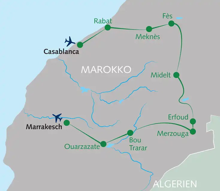 Von der Küste bis zur Wüste, von Bergwelten bis in quirlige Gassen: Marokko überrascht. Wir starten in Casablanca und reisen durch jahrhundertealte Königsstädte voller Geschichten und Gewürzduft. Anschließend tauschen wir den Trubel gegen die Stille der Sahara – auf einer mehrtägigen Kameltour erleben wir die Weite der Dünen im warmen Licht des Sonnenuntergangs. Im Hohen Atlas erwarten uns grüne Täler, einsame Bergdörfer und herzliche Begegnungen bei Couscous und Minztee. Und wenn wir denken, das Beste liege bereits hinter uns, öffnet Marrakesch seine Tore – eine Stadt, die Tradition, Lebensfreude und Natur in sich vereint. Sei dabei!